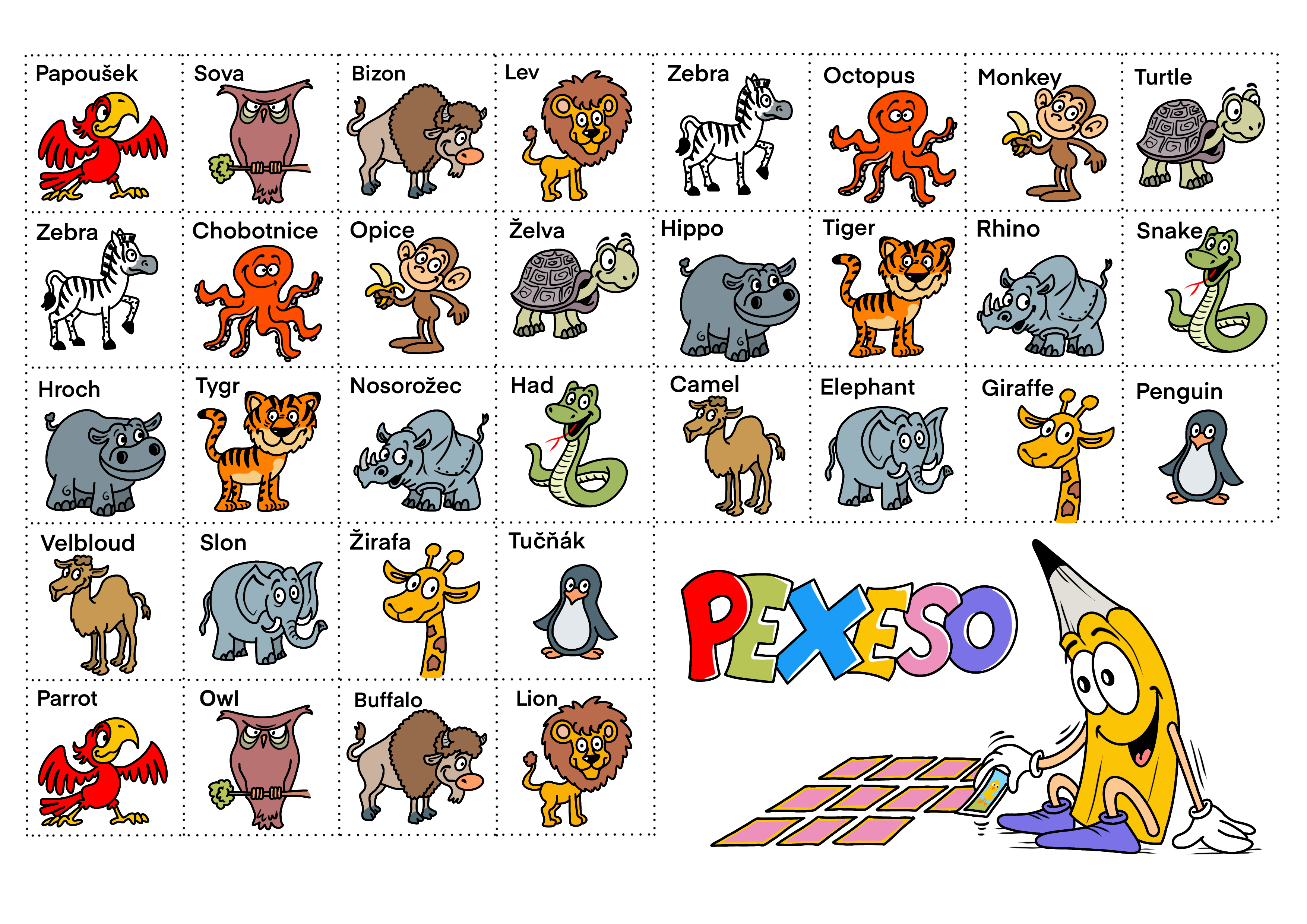 Kdo by nemiloval pexeso? Rozstříhejte jednotlivé kartičky se zvířátky ze ZOO a pusťte se do hry. Na každé kartičce najdete název zvířátka v češtině nebo angličtině. Hledejte jim ten správný protějšek. Krom těch obvyklých zvířátek, jako je slon nebo žirafa, narazíte i na méně běžná, jako jsou chobotnice nebo bizon. Kdo zvítězí a kdo umí pojmenovat nejvíce zvířátek v angličtině?