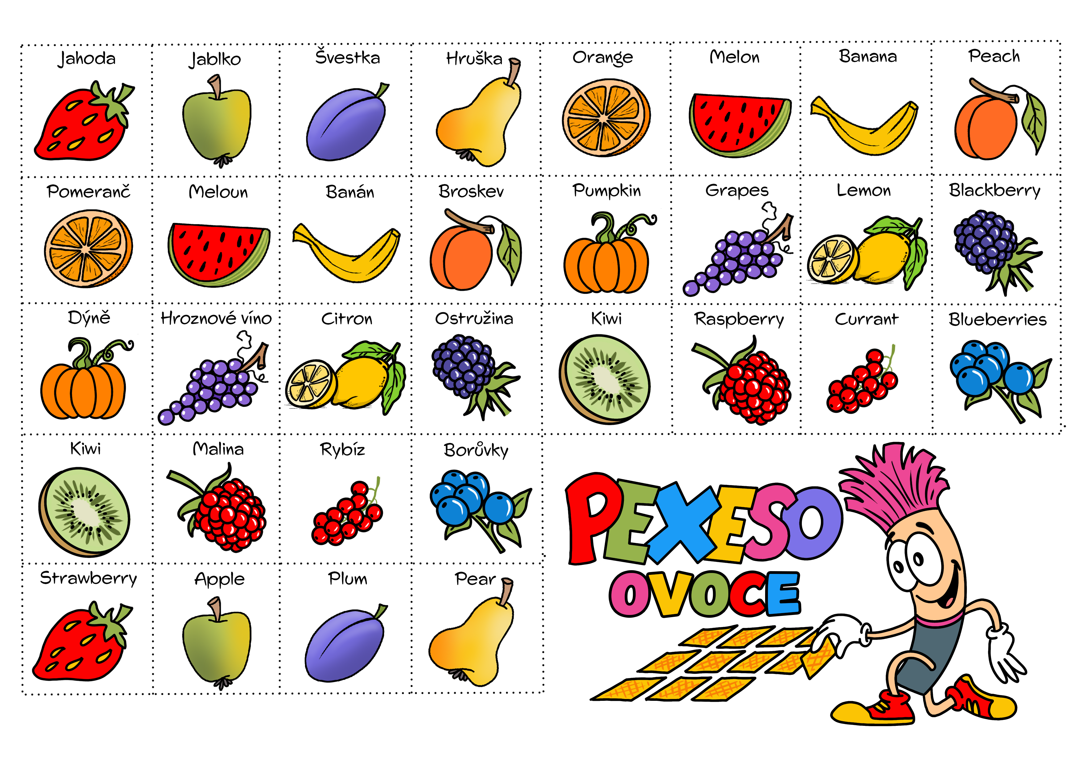 Procvičte si anglické názvy ovoce a zeleniny zábavnou formou. Zahrajte si pexeso! Jak se řekne dýně? Jak hruška? Co třeba citron nebo pomeranč? A co se naopak jmenuje úplně stejně v češtině i angličtině? Procvičte si slovní zásobu i paměť a spojte zábavné s užitečným.