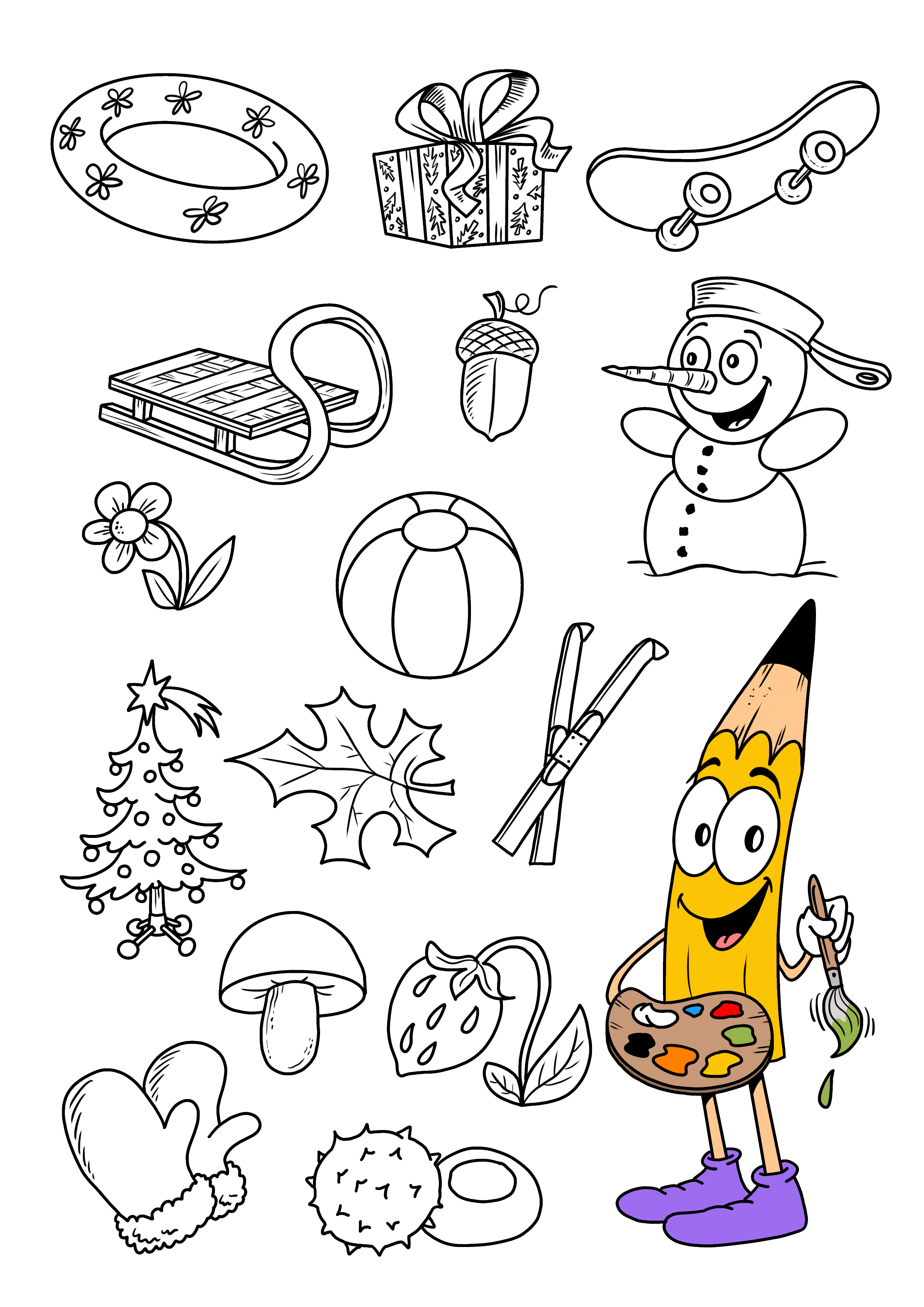 Omalovánka zaměřená na roční období. Které z předmětů na obrázku nejsou běžně spojené se zimou? Vymalujte všechny a vyškrtněte ty, které do zimy nepatří. K jakým měsícům v roce by se naopak hodily? Povídejte si společně o ročních obdobích.
