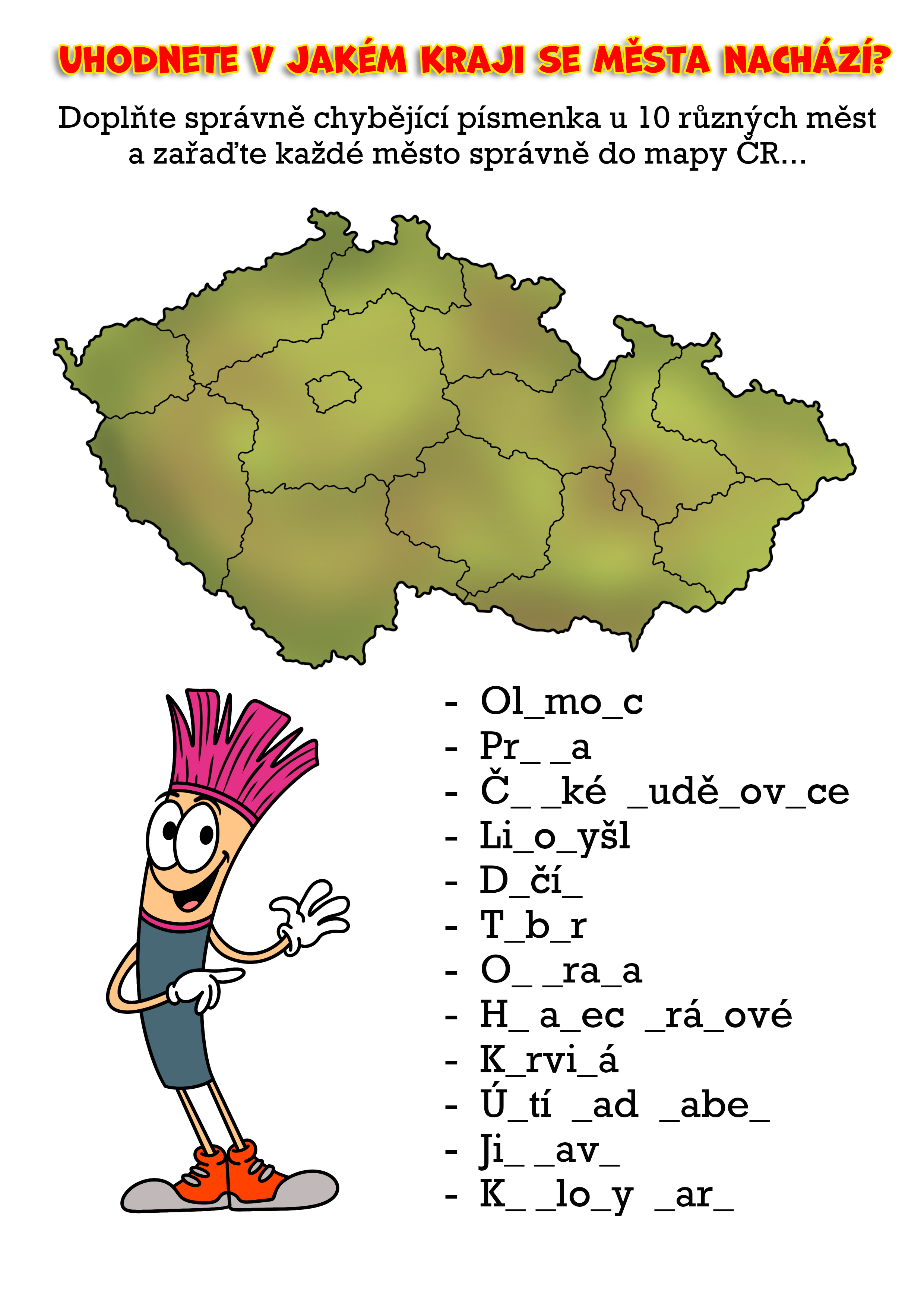 Vytiskněte si pracovní list a doplňte chybějící písmenka do názvů měst. To bylo snadné, že? Dokáže váš potomek pojmenovat také všechny kraje, jejichž hranice jsou naznačeny na mapě České republiky? A zvládne také města správně rozdělit do jednotlivých krajů? A která z měst jsou krajská? Poznáváme Česko!