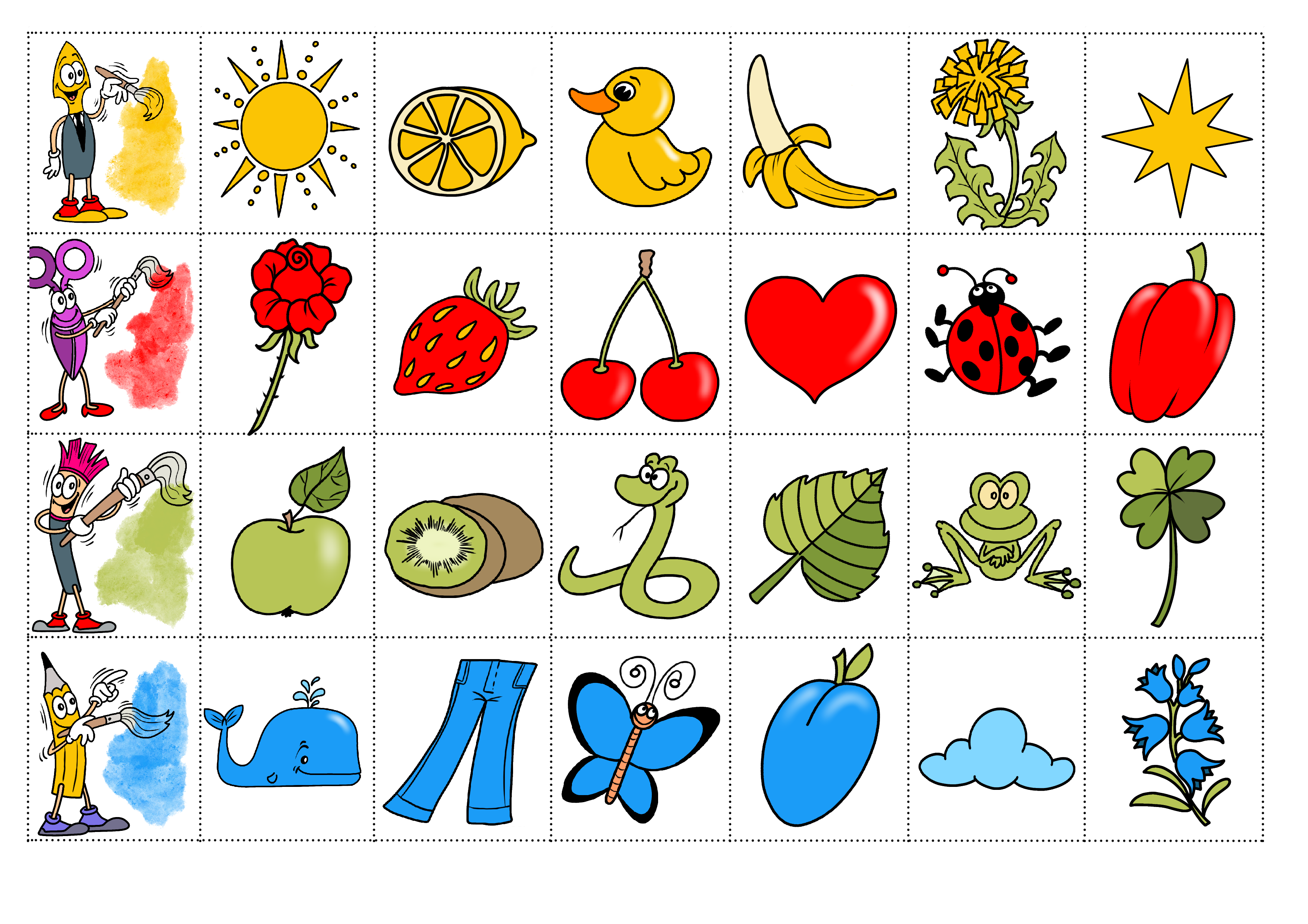 Tabulku s barvami a obrázky můžete použít buď jako přehled, nebo můžete jednotlivá políčka s obrázky vystřihnout a správně je řadit podle barev. Zopakujte si, co všechno může být žluté, červené, zelené nebo modré.