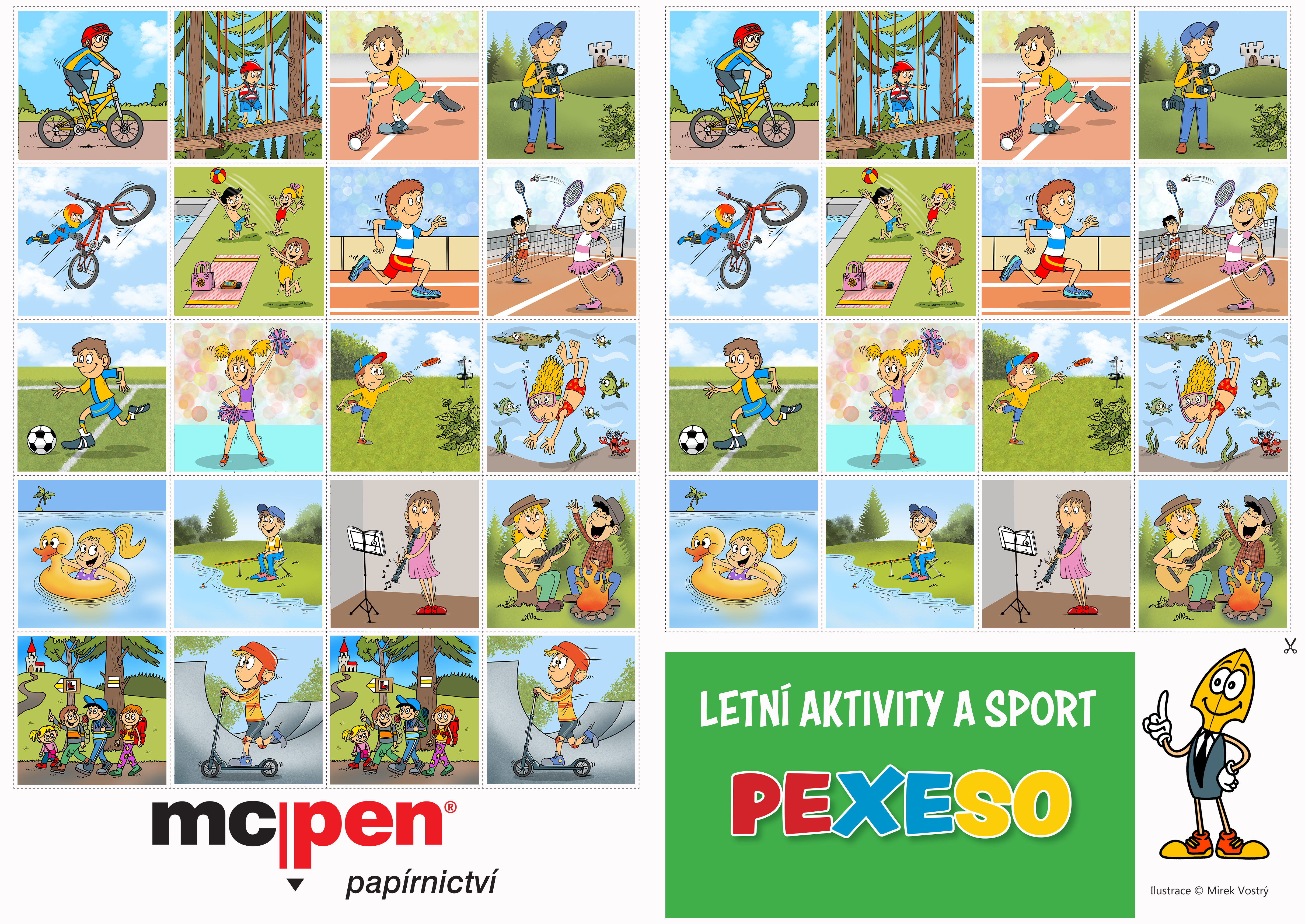 Pexeso plné letních aktivit a sportů! Rozstříhejte a povídejte si o každé z aktivit. Co se na obrázku děje, jedná se o aktivitu, která baví i dítě? Které z aktivit jsou mu blízké, a které by chtělo zkusit? Zabavte se za deštivých dnů, během dlouhých cest vlakem, nebo jen tak doma. Rozvíjejte verbální dovednosti dětí a bavte se!