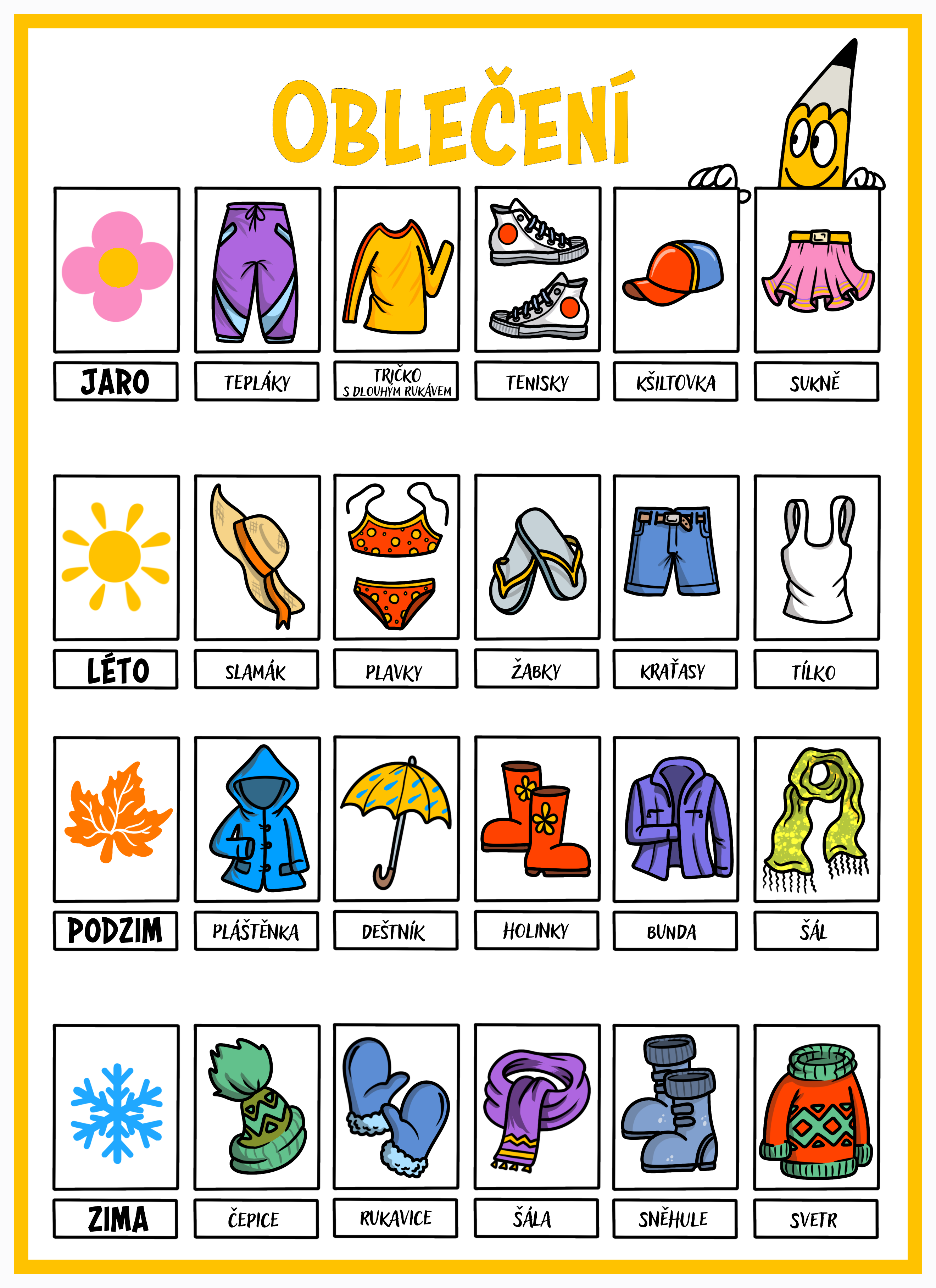 Kdy si děti obléknou plavky a kdy raději teplý svetr? Vytiskněte si obrázky oblečení pro každé roční období a vystřihněte je. Nechte děti přiřadit správné oblečení k jaru, létu, podzimu a zimě. Povídejte si o tom, proč se v daném období nosí právě toto oblečení. Co si vezmou, když je chladno? Co se nosí k bazénu? A co je potřeba na lyžování? Objevujte společně svět módy!