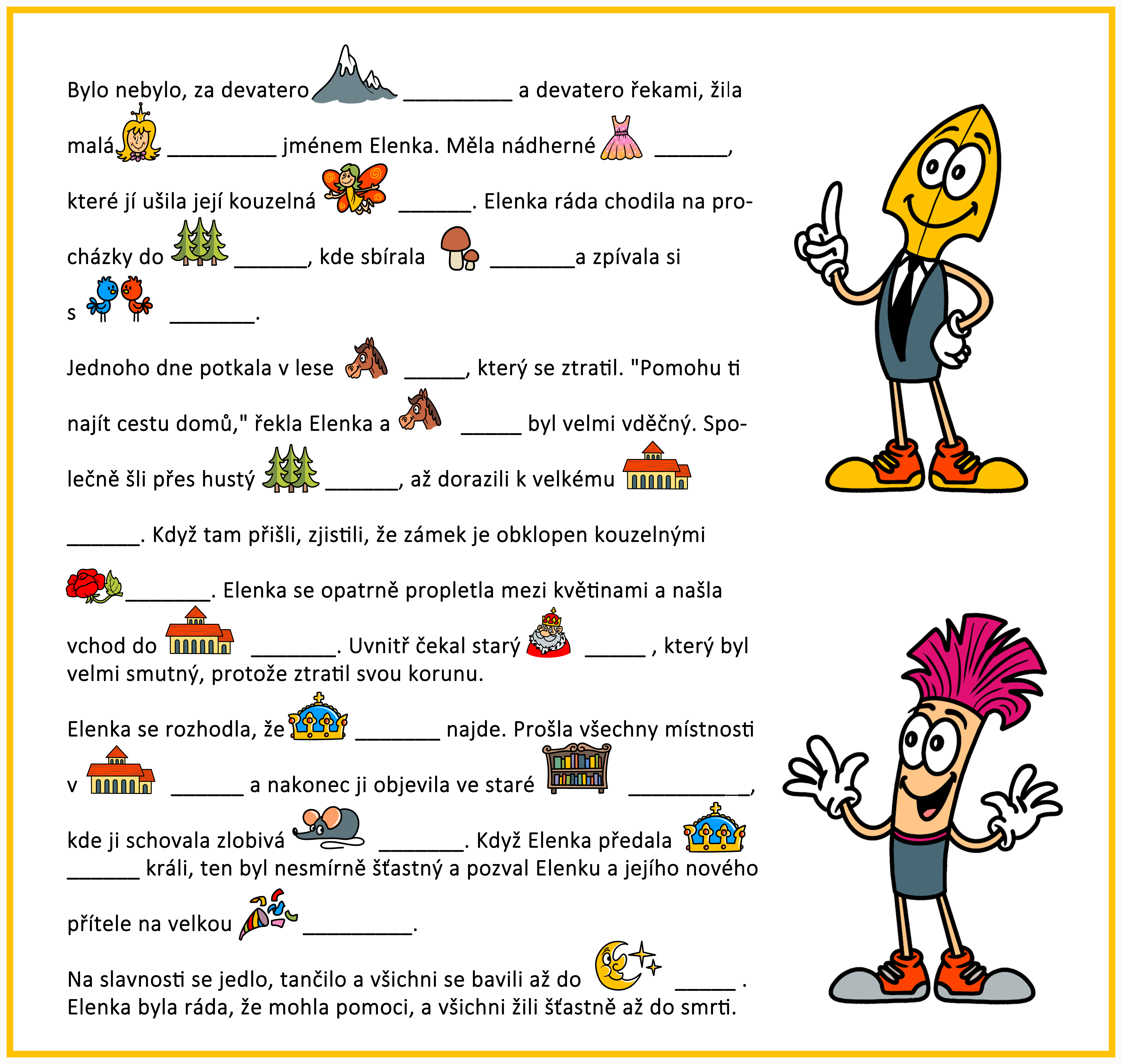 Vytiskněte si pohádku, přečtěte ji dětem a zastavte se u každého prázdného místa. Dokážete podle veselých obrázků správně doplnit chybějící text? Užijte si společné čtení a objevování kouzelného světa!