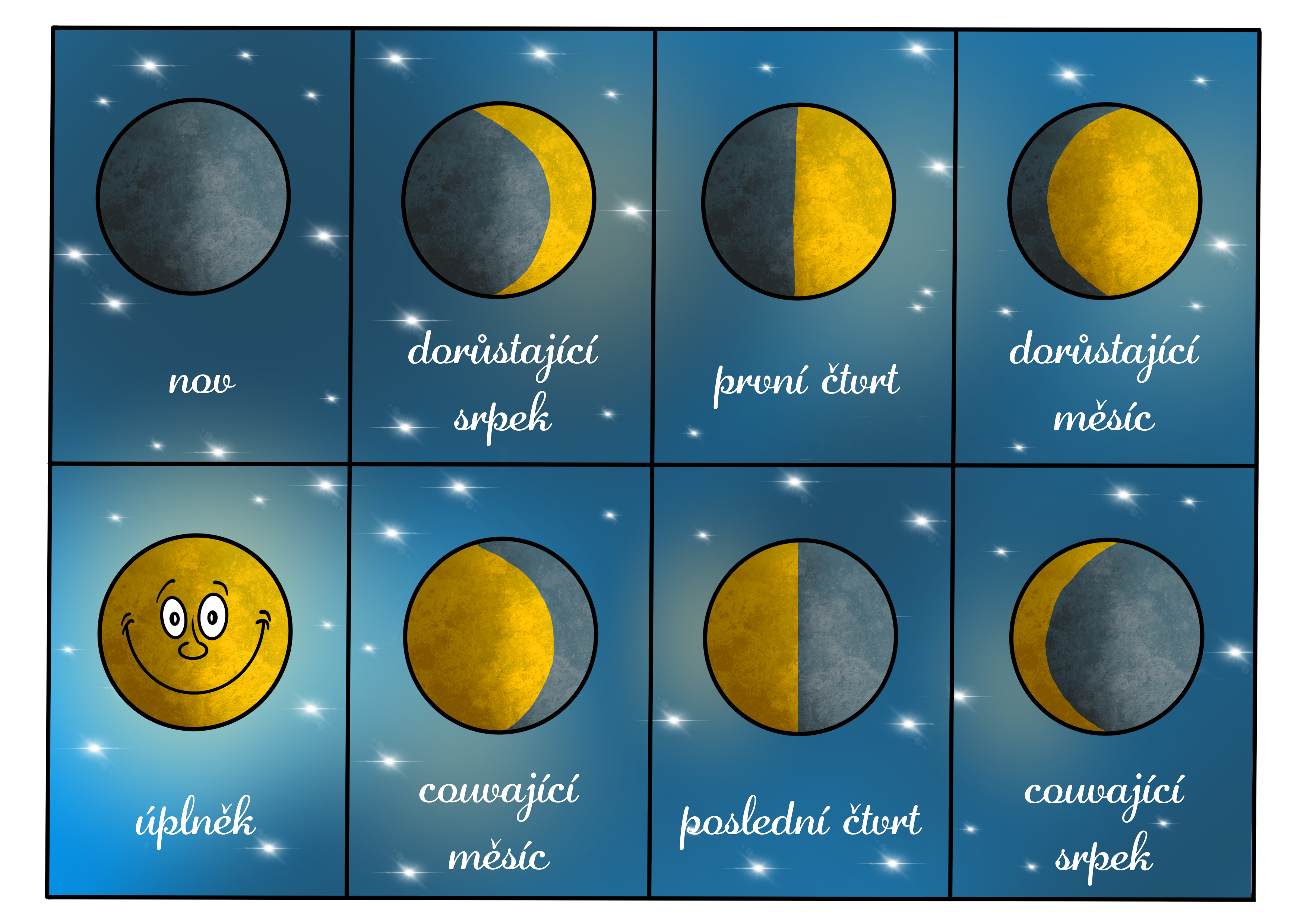 Obraťte své zraky k noční obloze a pozorujte se svými dětmi jednotlivé fáze Měsíce. Odpíchněte se od novu. Vysvětlete si s dětmi, jak Měsíc odráží světlo od Slunce a ze Země tak lze pozorovat vždy jen jeho nasvícenou část. Nebojte se využít míčky či jiné předměty pro demonstraci situace. Aktivita je ideální pro letní měsíce, kdy je vyšší pravděpodobnost jasných nocí. Staňte se společně lunatiky!