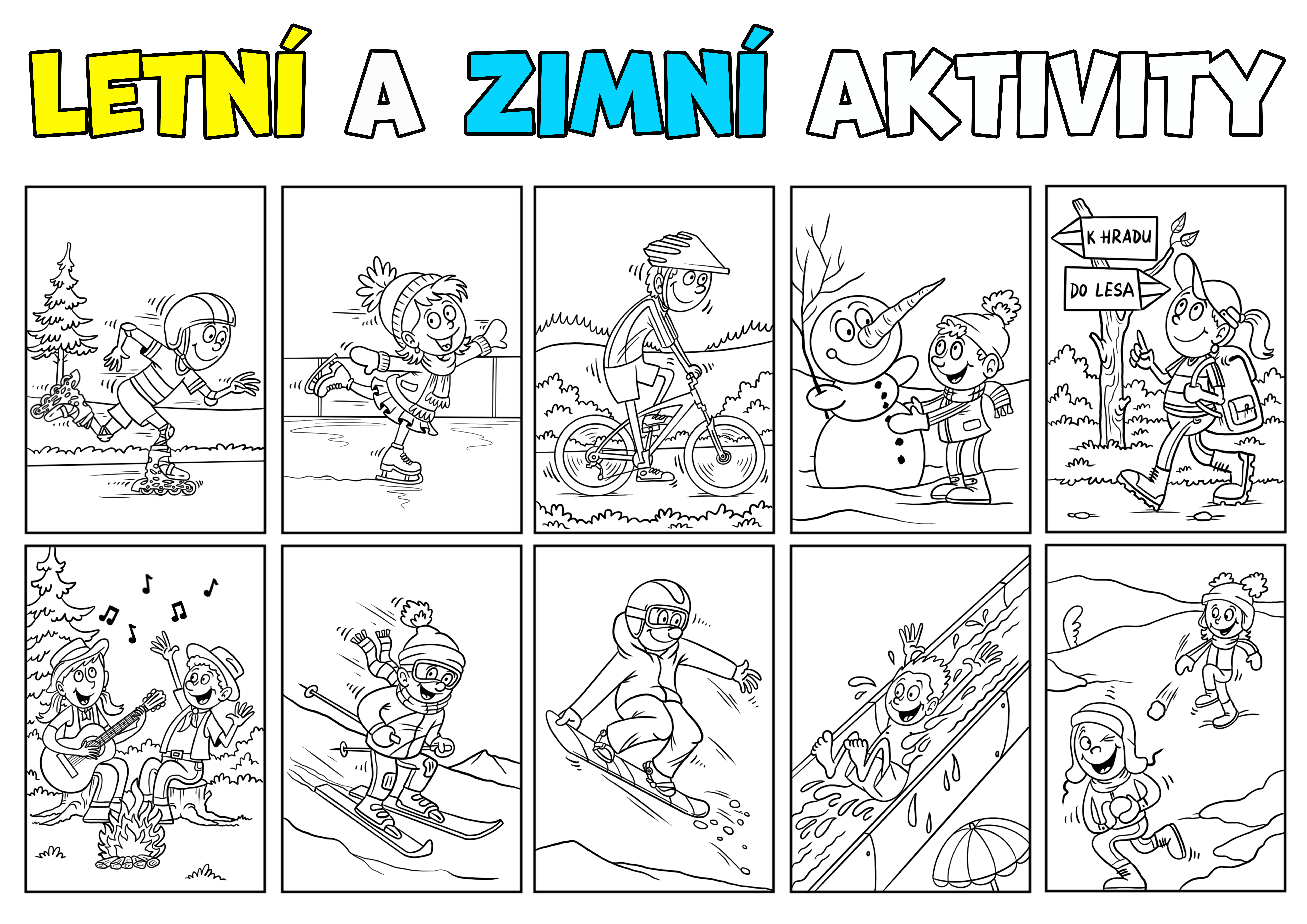 Vybarvujte s dětmi omalovánky s motivem zimních a letních aktivit. Obrázky vystřihněte a roztřiďte je. Jaké činnosti jsou spojené s letními měsíci, a jaké se zimními radovánkami? Povídejte si s dětmi o koloběhu roku.