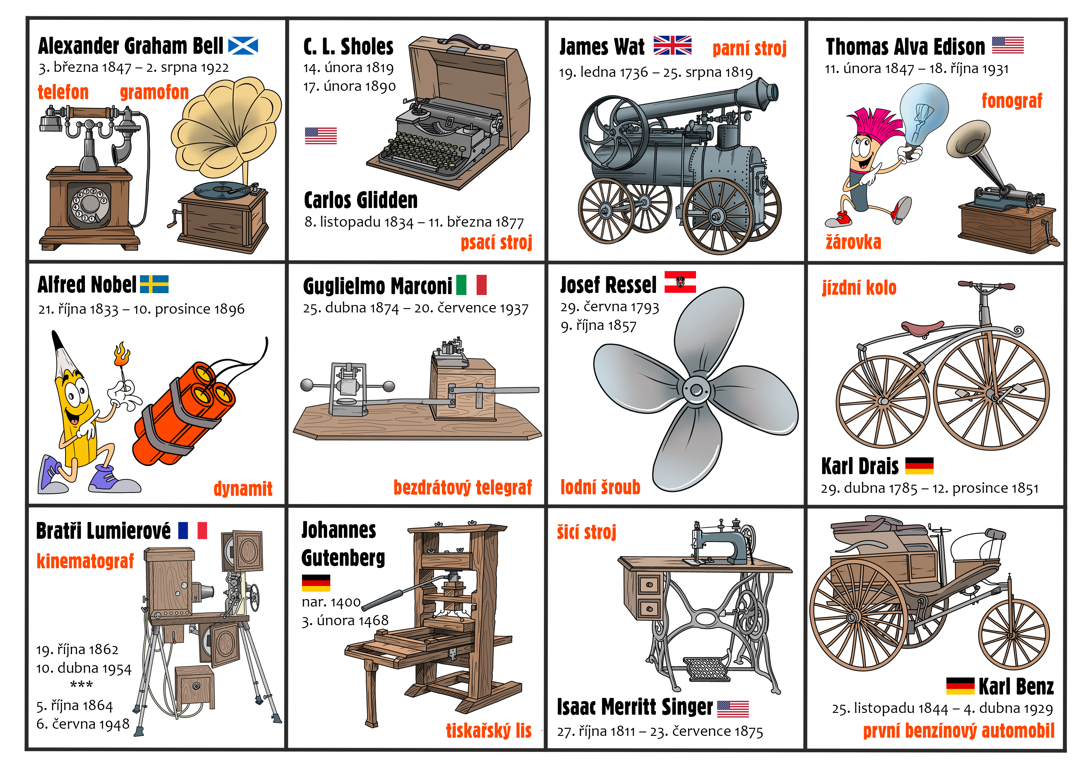 Kdo a kdy vynalezl jízdní kolo? Kdo se poprvé projel s benzínovým automobilem? Kdo odstartoval století páry? Odkdy mohou lidé používat telefon? Jak dlouhá byla cesta od vynálezu kinematografu k Netflixu? Zorientujte se mezi zásadními vynálezy v dějinách lidstva a podívejte se kdo a kdy objevil 12 z nich.