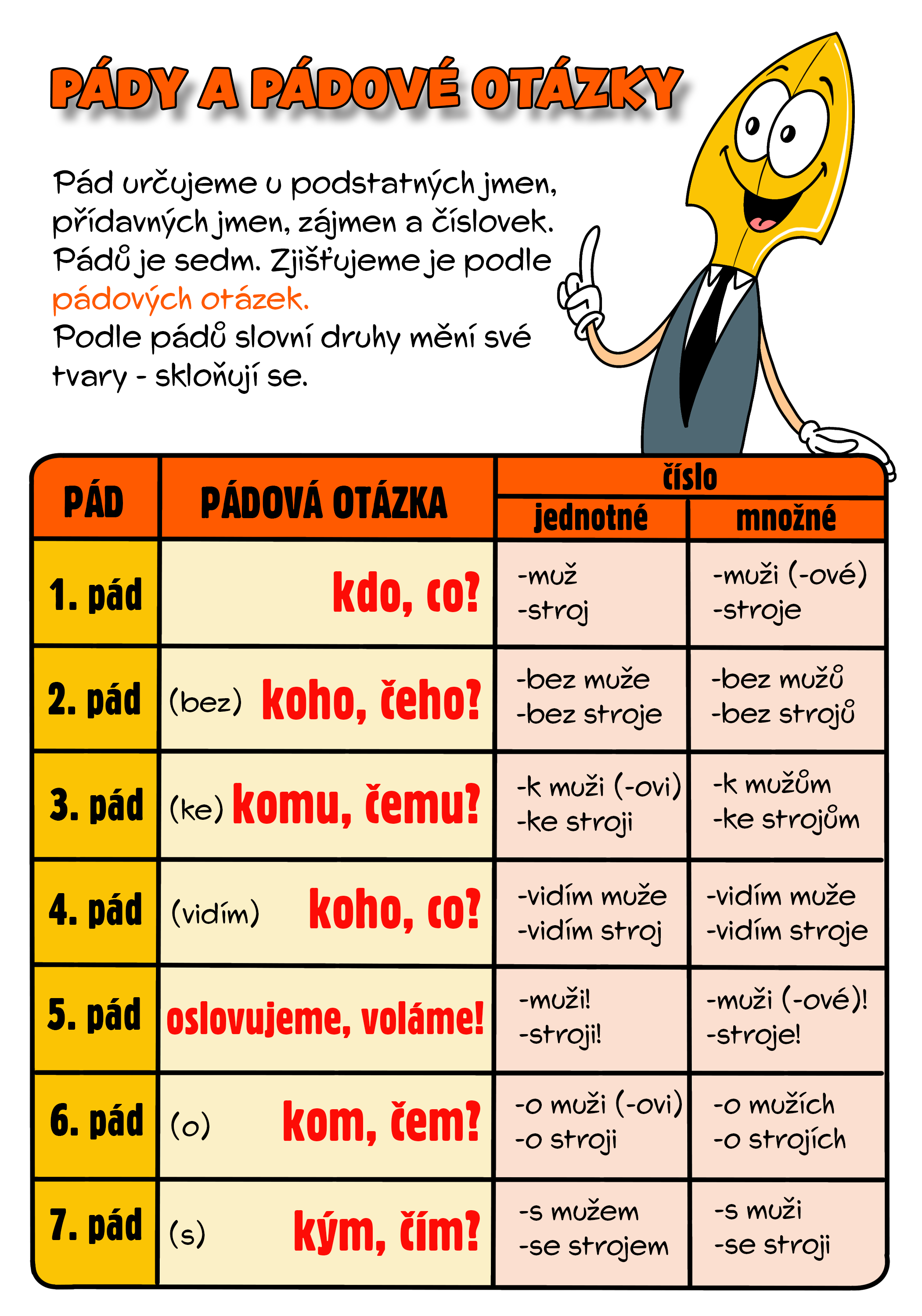 Přehledná tabulka pádových otázek pro všechny, kdo se s nimi seznamují nebo bojují. Praktický pomocník pro domácí přípravu a skloňování jednotného i množného čísla. Uplatní se na každém pracovním stole i v každém penálu.