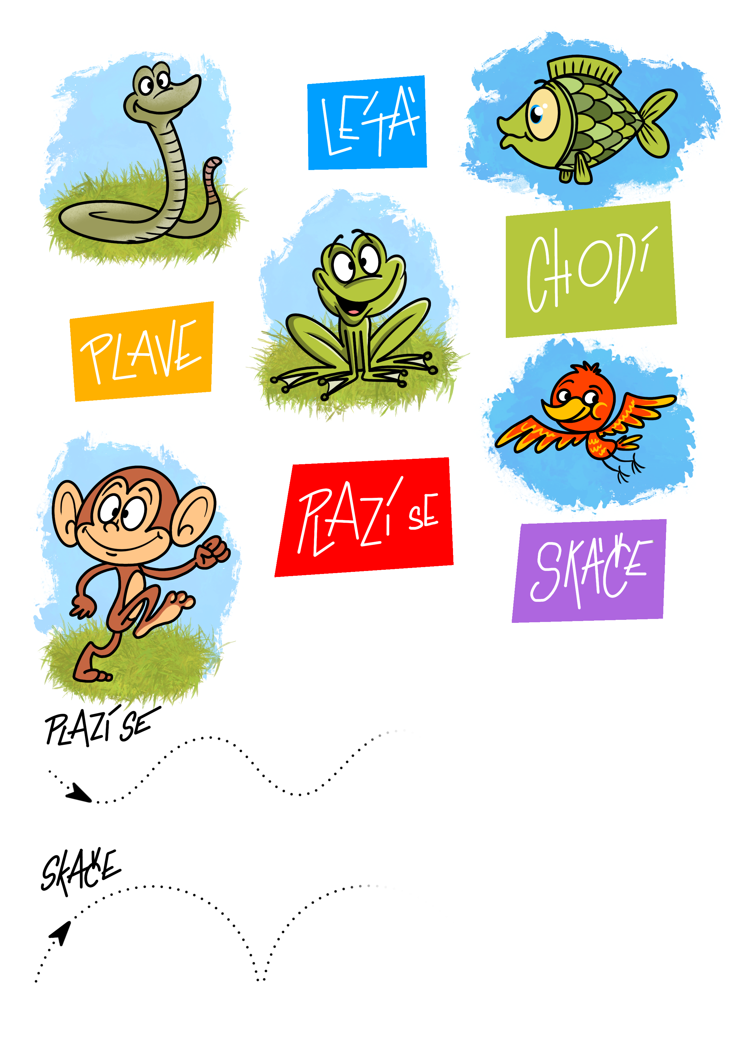 Každé zvíře se pohybuje jinak. Zatímco některá zvířátka chodí, plazí se, či skáčou po zemi, jiná poletují vzduchem, další třeba plavou. Povídejte si s dítětem o tom, jak se které zvíře pohybuje a trajektorie jejich pohybu využijte pro nácvik souvislé linky tužkou.