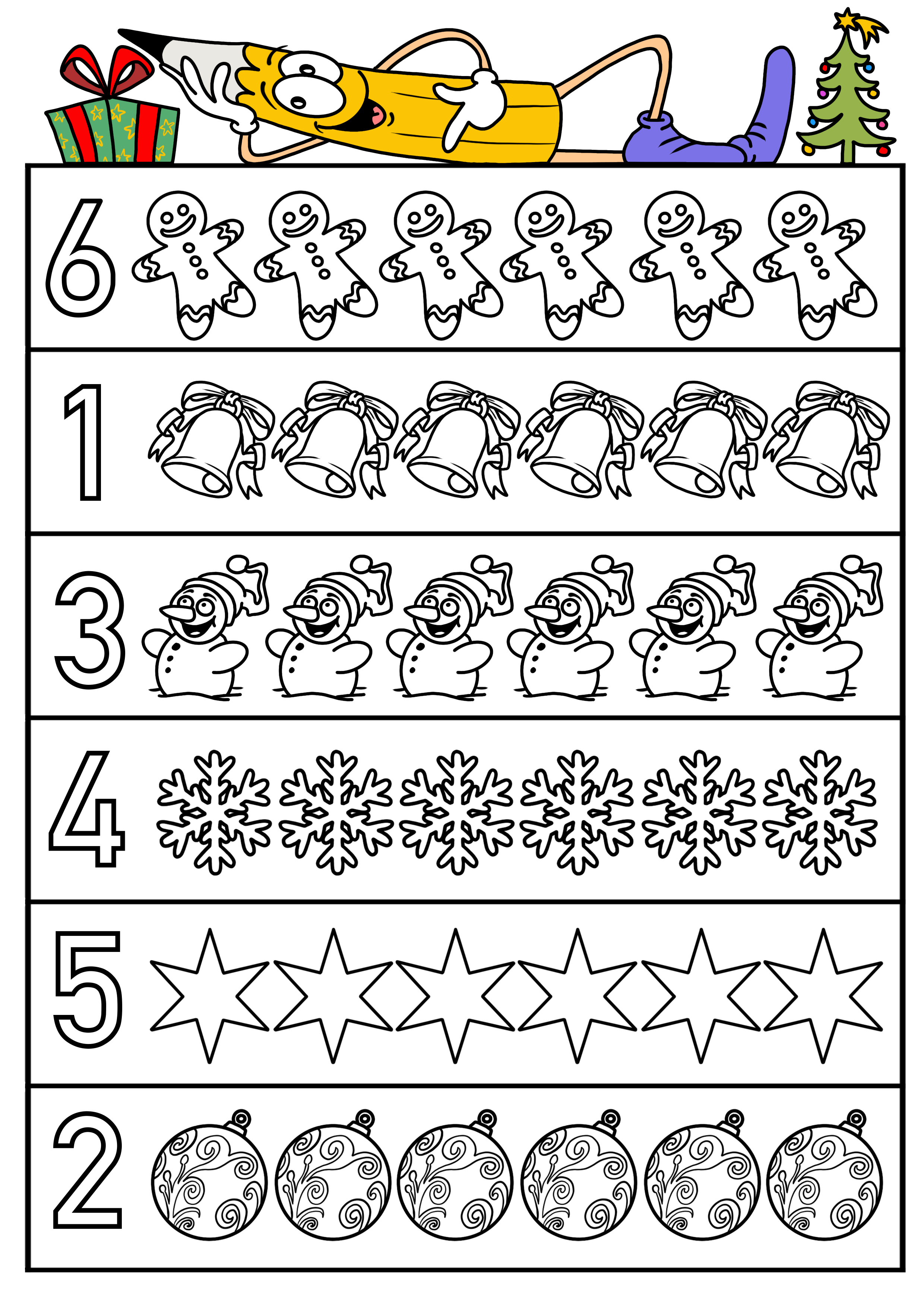 Nalaďte se adventně a vybarvěte tolik obrázků v řádku, kolik vám určuje číslo. Tedy šest perníčků, jeden zvoneček, tři sněhuláky, čtyři vločky, pět hvězdiček a dvě vánoční koule. Výtvarnému pojetí se meze nekladou! Zapojte barvy a fantazii.