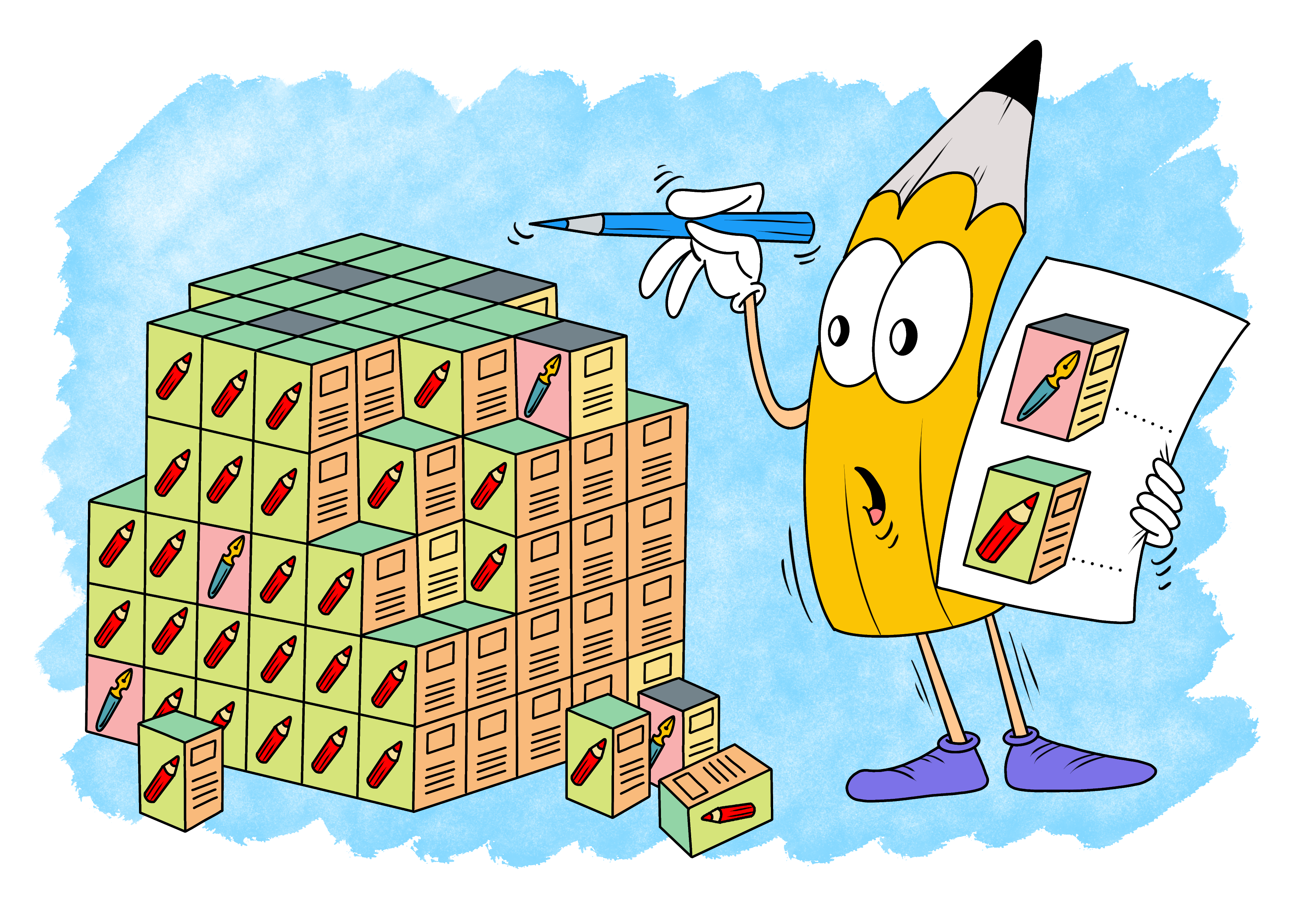 Udržet si přehled o skladových zásobách není jen tak. Zvlášť, když jde o zásoby velkého papírnictví. Kolik je na obrázku krabic s pastelkami a kolik s pery? Věnujte pozornost barvám krabic, motivům na nich a počítejte.