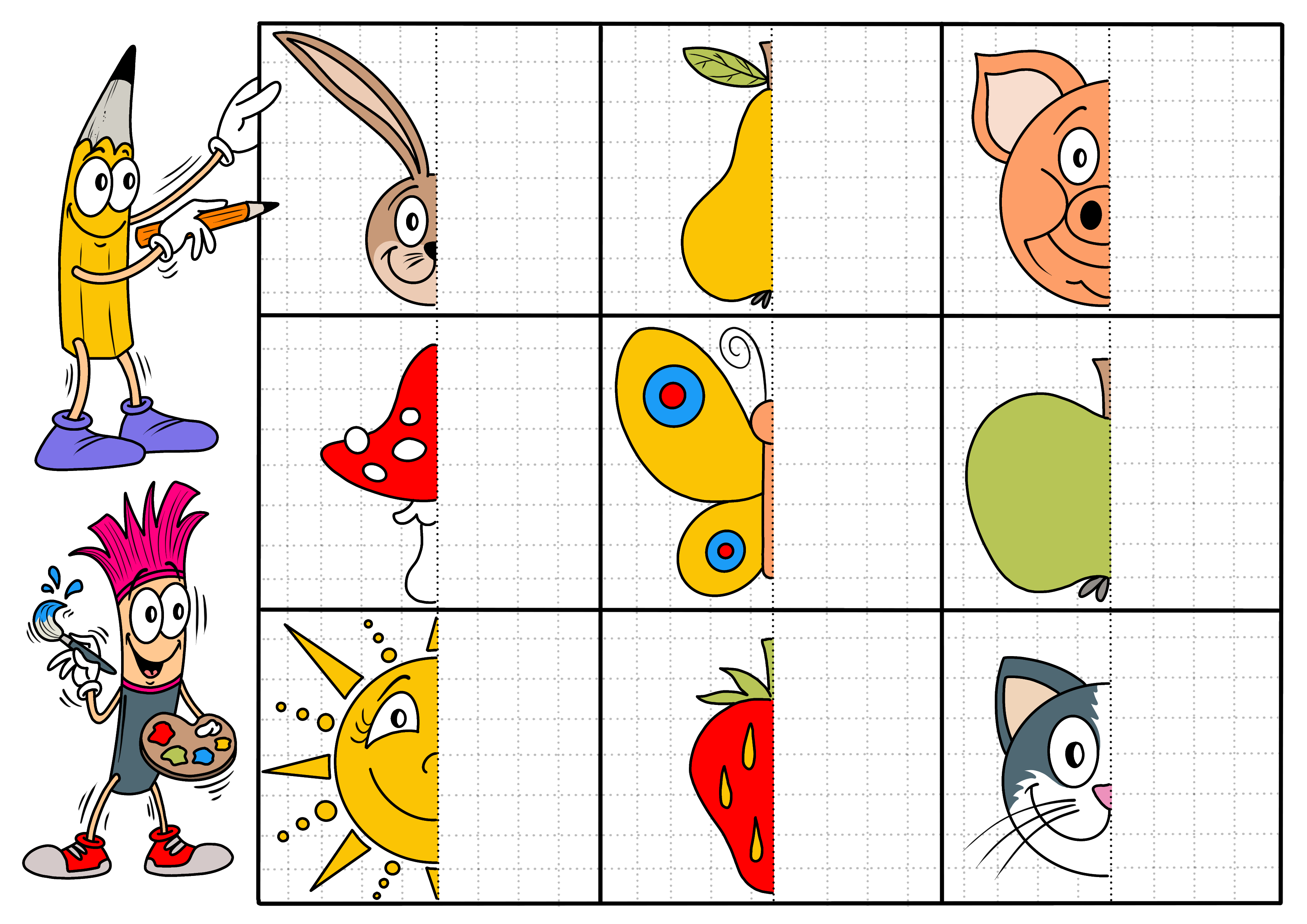 Ověřte si svůj smysl pro detail! Vytiskněte si obrázek, dokreslete ho tužkou a vymalujte druhou polovinu. Na dokončení čeká zajíček, hruška, jahoda, motýl, muchomůrka, kočička, jablko, sluníčko a prasátko. S přesností vám pomůže tenký rámeček.