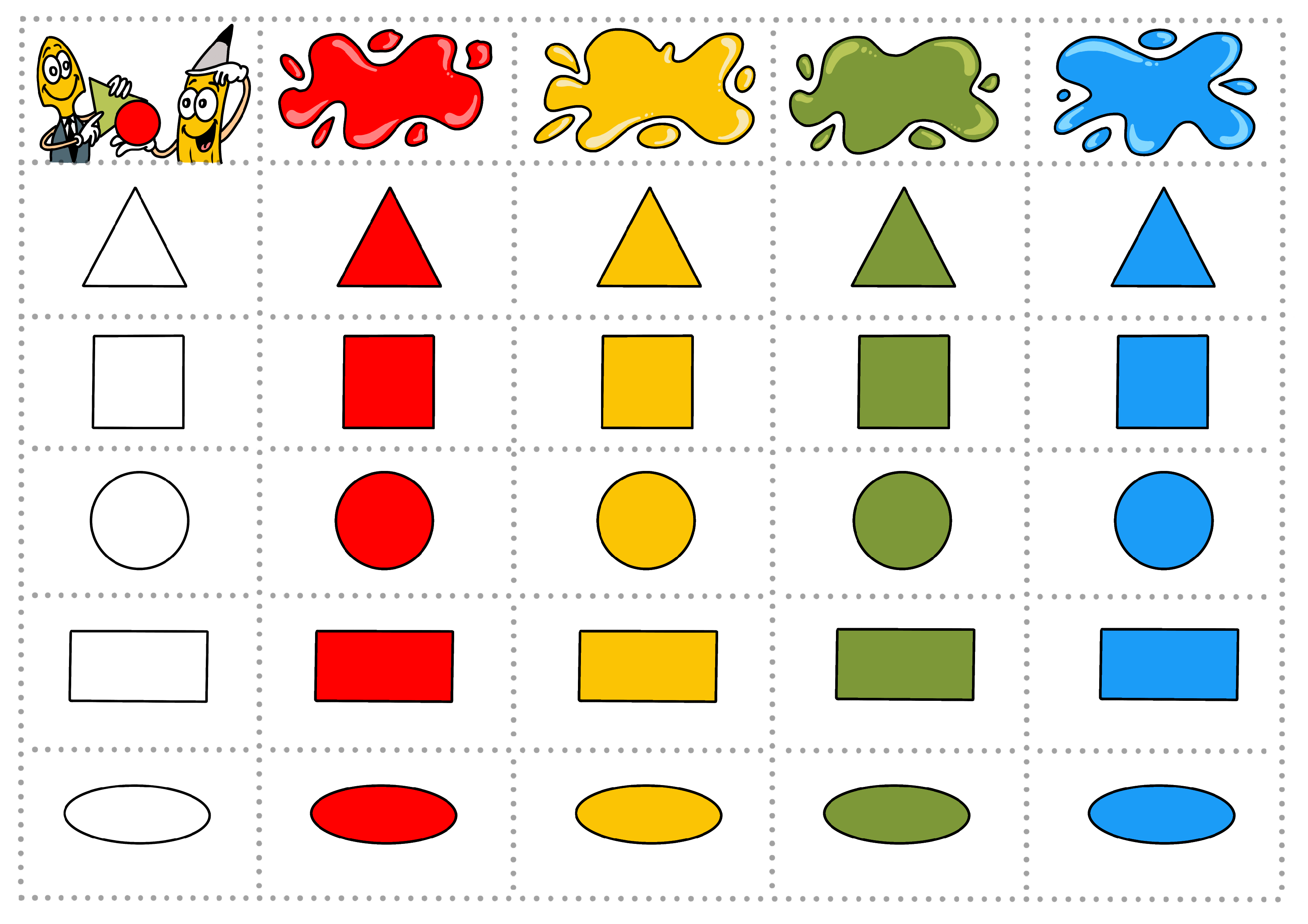 Různé tvary a různé barvy, to je výzva! Vytiskněte si tabulku, vystříhejte barevné tvary podle dělících čar a seřaďte je správně podle barvy do sloupce i podle tvaru do řádku. Zvládnete i všechny pojmenovat? Kartičku můžete také bez stříhání používat jako přehled barev a tvarů.