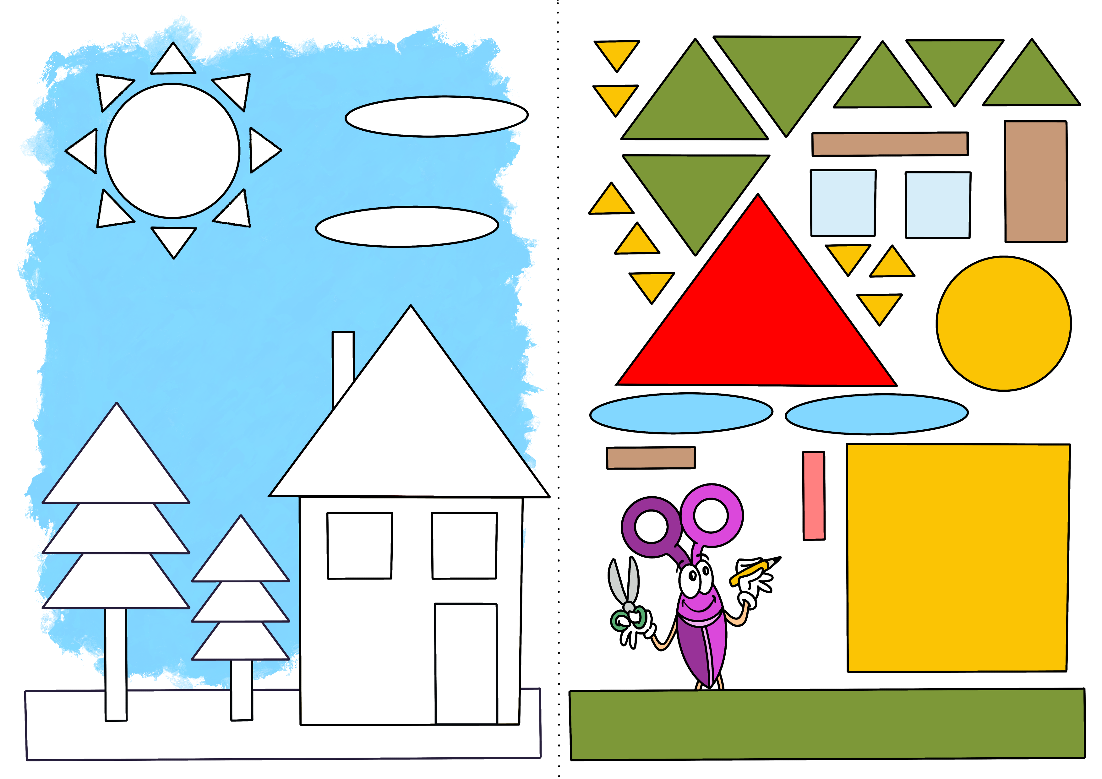Už máte v malíku všechny barvy i základní tvary? Vytiskněte si obrázek, vystříhejte tvary z pravé strany a nalepte je na správná místa a ve správném pořadí na levou část obrázku. Jaký geometrický tvar připomíná nejvíce střechu domečku? Jaký sluníčko a jaký okna a dveře? Zamyslete se a zjistíte, že geometrické tvary jsou všude kolem nás. Napadají vás další?