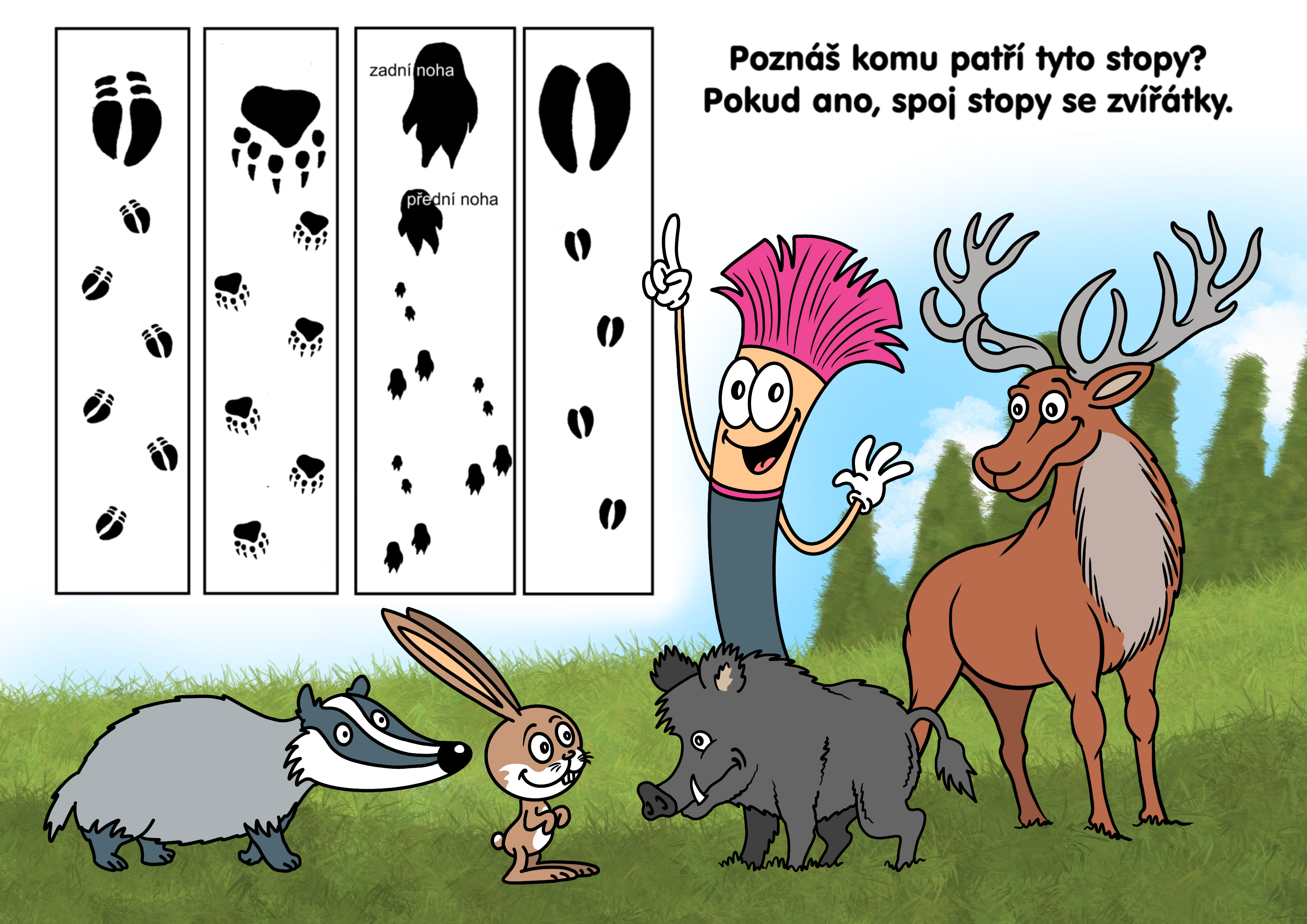 Poznáte, kdo zanechal svoje stopy na lesní cestě? Kdo má kopýtka? Kdo packy? A kdo při chůzi zanechává v měkké půdě jaký rytmus stop? Zahrajte si na stopaře a identifikujte správně otisky zvířecích pacek v měkké půdě. Mezi stopovanými zvířaty je jezevec, zajíc, divočák a jelen.